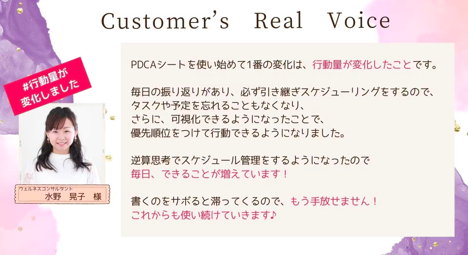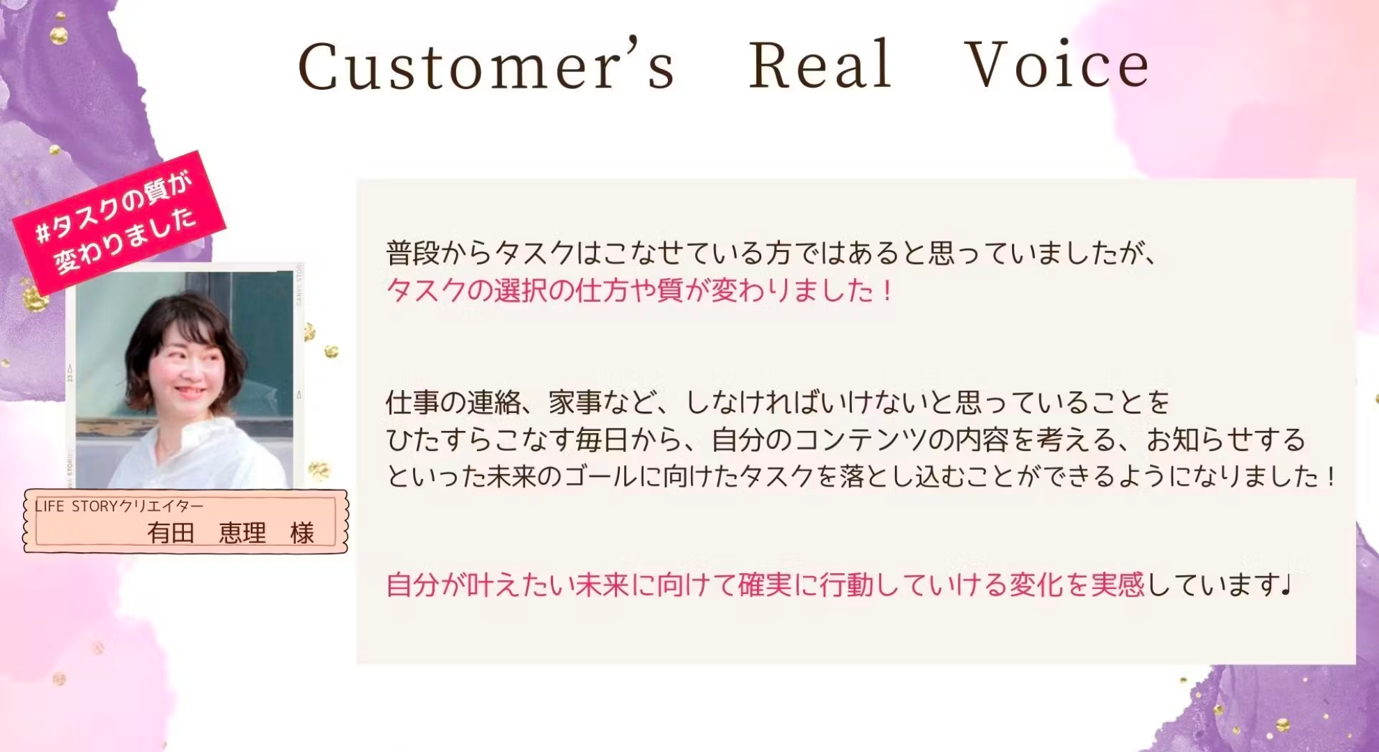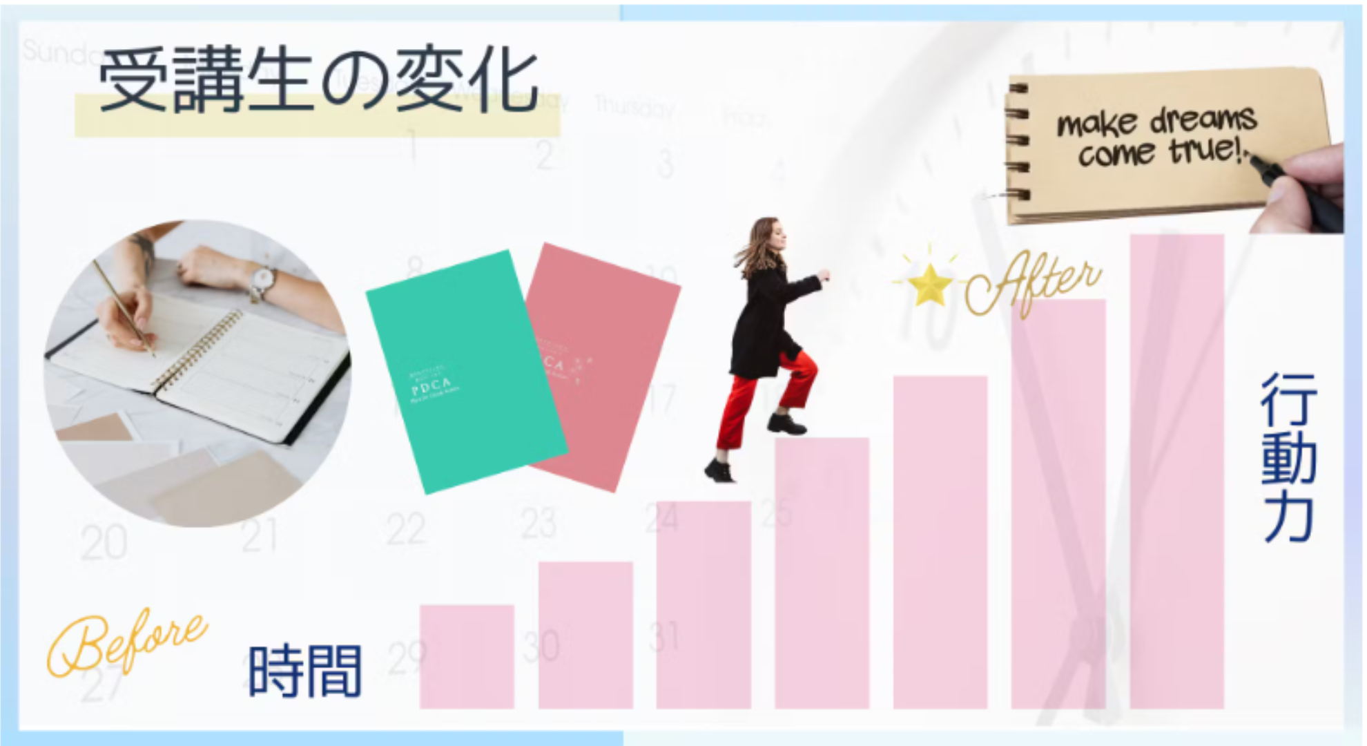 ご受講後、行動出来るようになった、目標達成が前倒しにできたなどお声をいただいております。